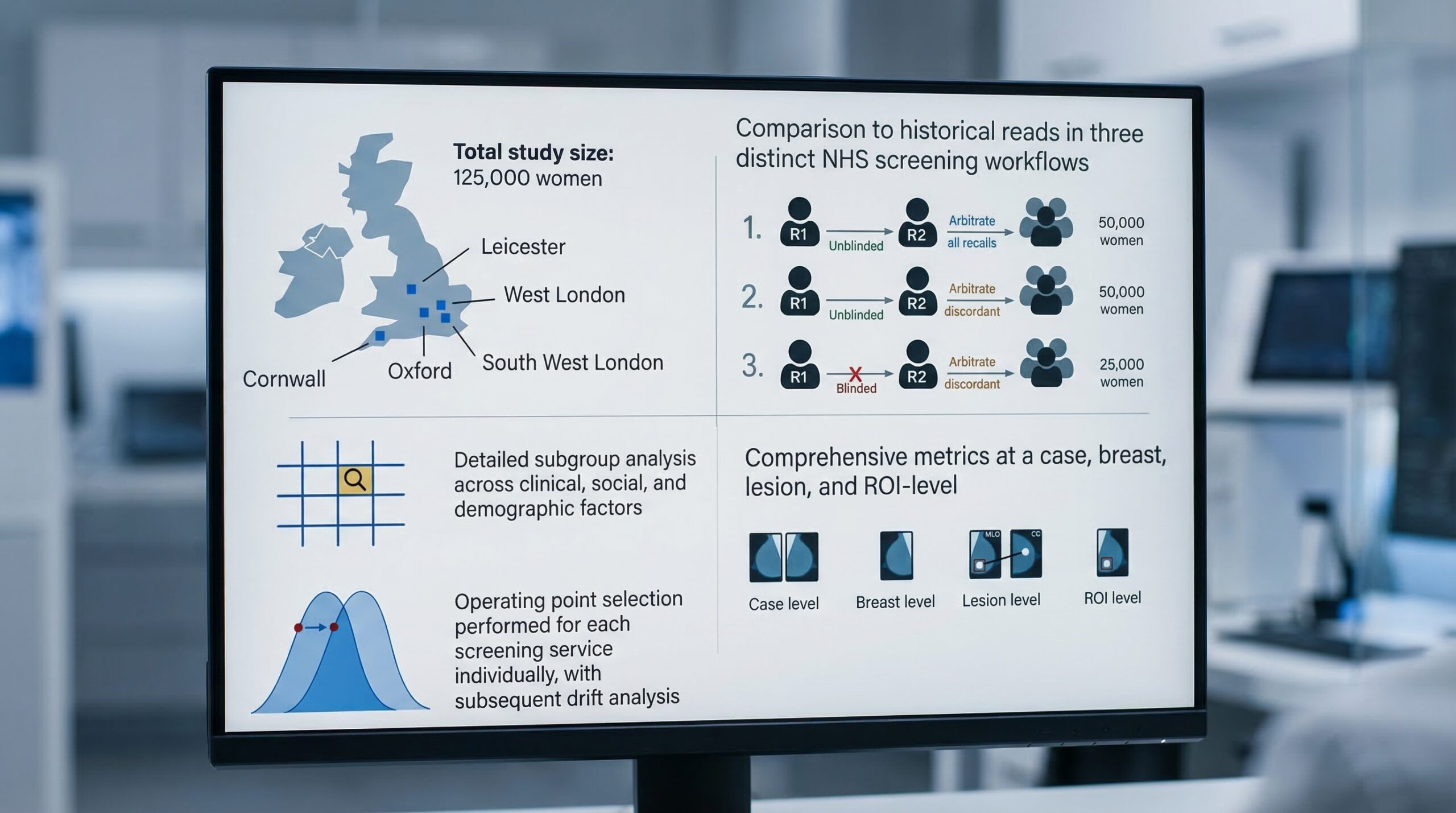 El estudio, con una magnitud impresionante que abarcó a 175.000 mujeres del NHS, se dividió en tres fases rigurosas. La primera, retrospectiva, analizó más de 115.000 mamografías, demostrando que la IA, operando como un segundo lector, elevó la tasa de detección de cáncer (CDR) de 7.54 a 9.33 por cada 1.000 mujeres. Esto significó más cánceres invasivos identificados, una reducción notable de falsos positivos y la identificación del 25% de cánceres que antes pasaban desapercibidos entre visitas. Además, en las primeras mamografías, la IA redujo un 39.3% los recalls innecesarios y acortó el tiempo de lectura en un asombroso 32.1%.